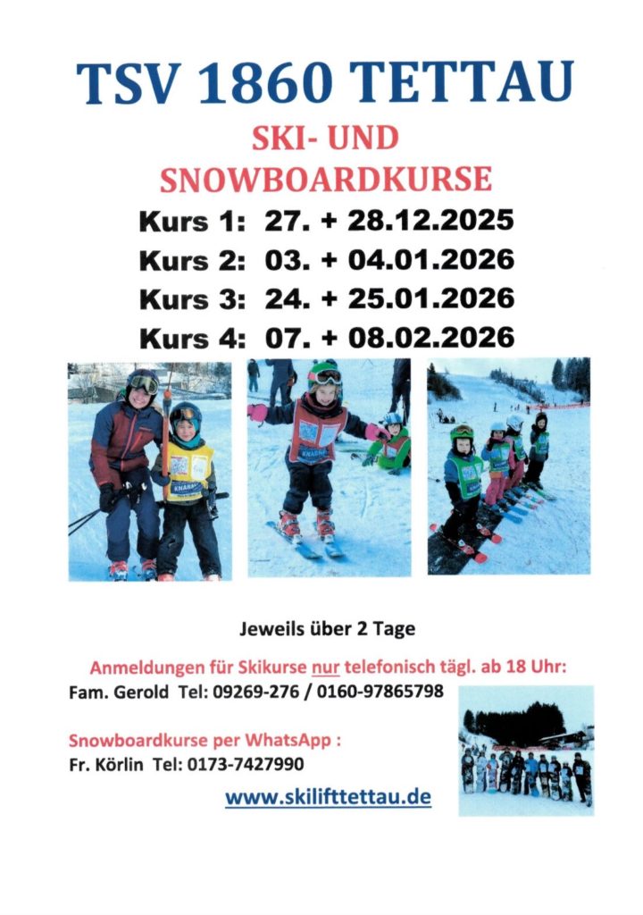 Ski- & Snowboardkurstermine 2025/26 ⛷️ 🎿 12. November 2025 Allgemein Endlich – unsere Ski- & Snowboardkurse sind geplant und wir freuen uns auf viele Skitage in Tettau ☀️❄️